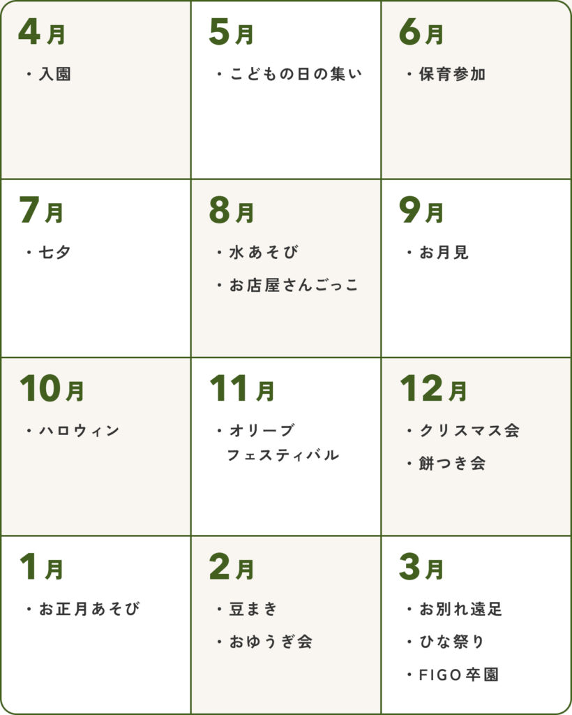 オリーブグループでは、年間を通じて、さまざまな行事があります。みんなで一つのことをやり遂げることで、子どもたちが達成感や充実感を味わうことができるように創意工夫しながら計画し、実施しています。